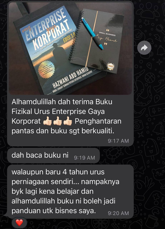 Setiap pemilik panduan Urus Enterprise Gaya Korporat ini akan dapat akses masuk ke GROUP BISNES SUPPORT** yang bernilai RM850 secara Percuma! Seolah olah anda ada company secretary untuk sebarang soalan lanjut tentang urus enterprise.