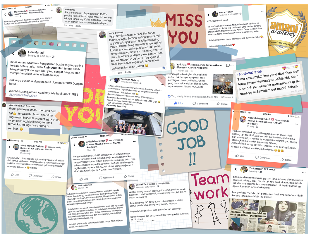 Amani Academy buku-kan Seminar Potensi Enterprise yang telah membantu ramai pemilik bisnes kecil di dalam bentuk penulisan yang santai, supaya boleh disebarkan dan membantu lebih ramai pemilik Enterprise yang tiada tempat untuk bertanya dan mengadu. Penulisan ini anda boleh baca melalui Telefon atau di Komputer, kami sediakan link-link rujukan yang anda boleh click sahaja dalam ebook ini untuk memudahkan pengurusan bisnes anda.